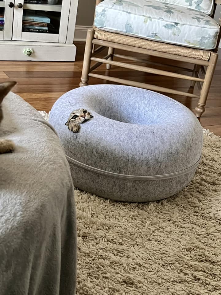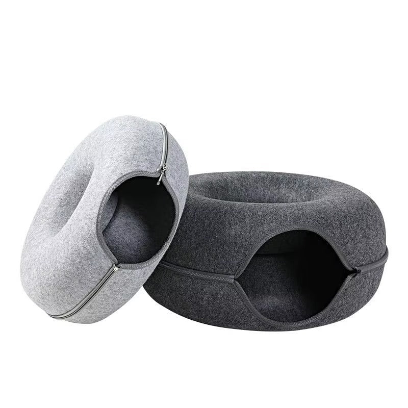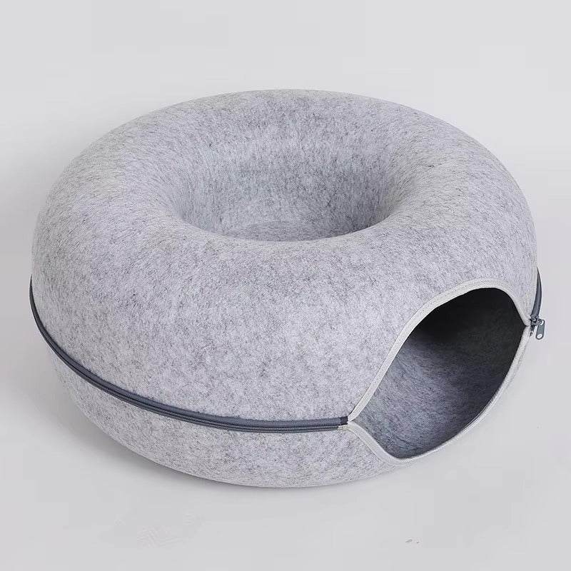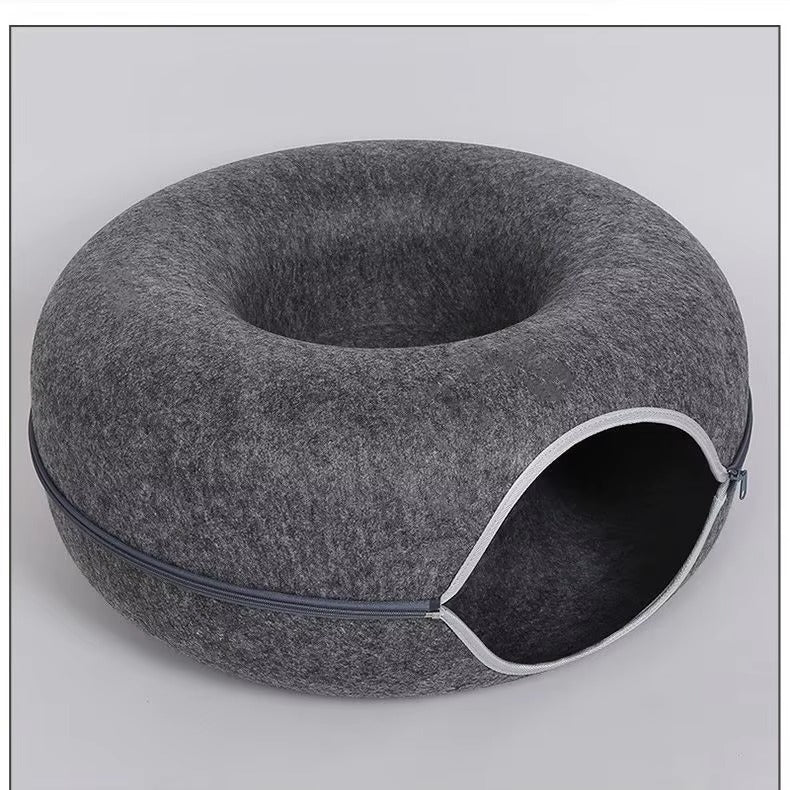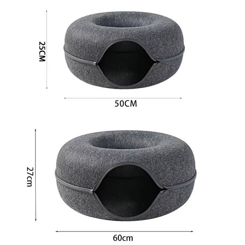 It's made from compressed, pliable fabric which is hard-molded into a donut-shaped, super cozy dwelling for cats to huddle under and snuggle in for a quiet, restful sleep or play fight with their feline friends.